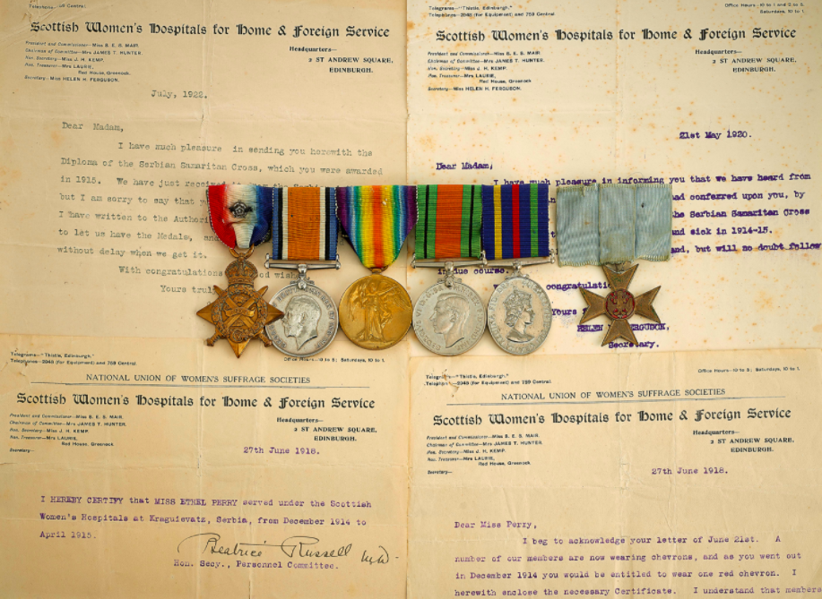 The auctioneers describe them as: “An extremely rare group awarded to Miss Ethel Perry, a member of the Scottish Women’s Hospitals and a member of the National Union of Women’s Suffrage Societies. Accompanied by original Scottish Women’s Hospital correspondence confirming the award of the Serbian Samaritan Cross … plus a number of original newspaper cuttings.”