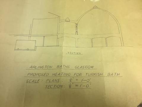 We still had no information on who constructed the Turkish suite or any plans of its construction as, like our original building, it pre-dates the need to lodge plans with the Dean of Guild. While consulting some plans from the 1940s of improvements to the heating system in the Alexander Hislop collection in Glasgow University, we found our first plan of the Turkish rooms.