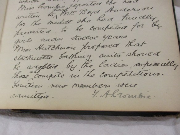 “Miss Hutchison proposed that stockinette bathing suits should be adopted by the ladies, especially those who compete in the competitions.”