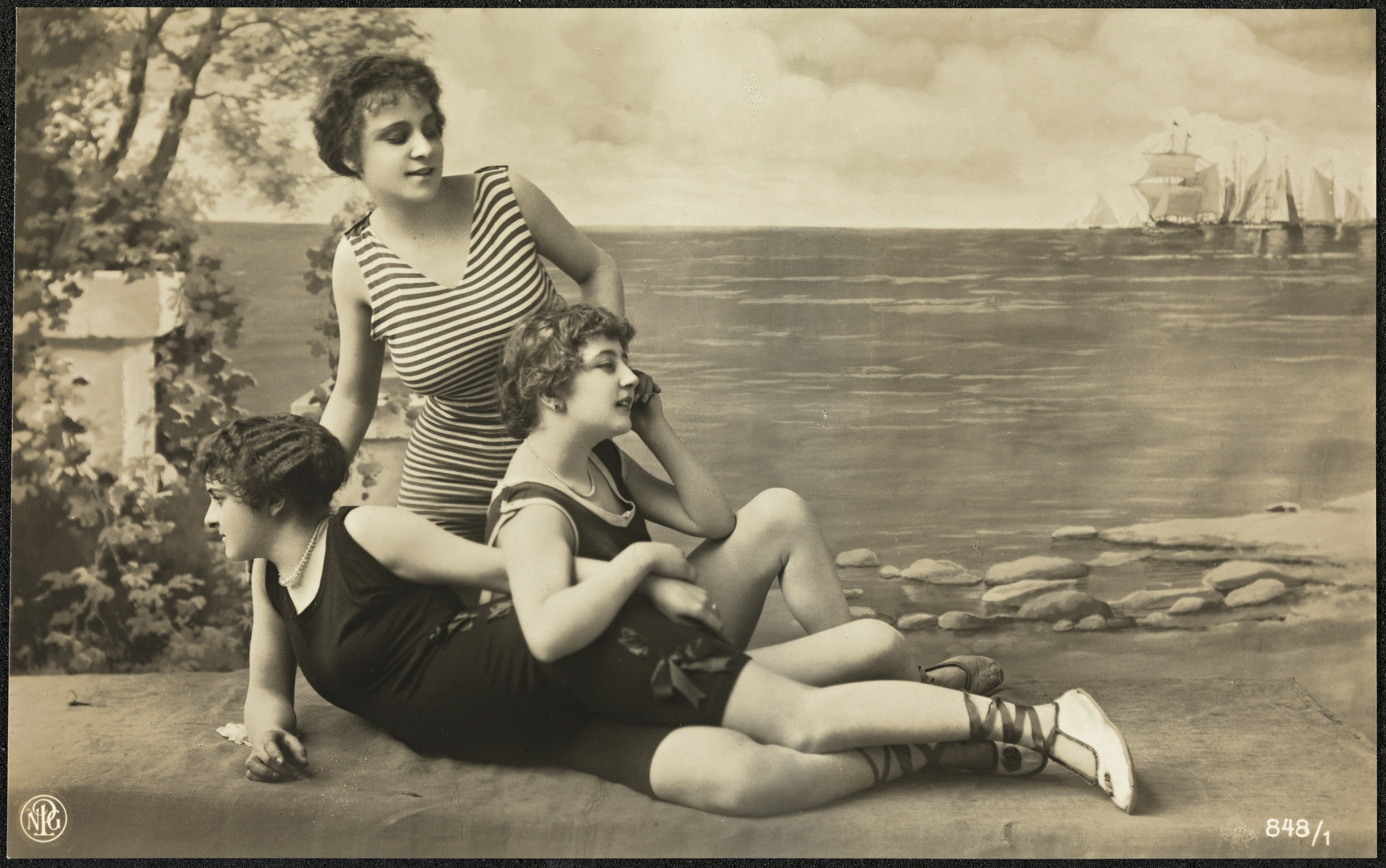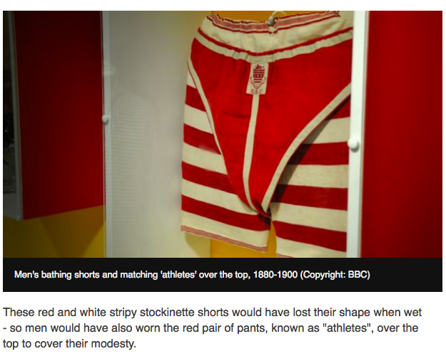 This picture shows striped stockinette swimming shorts for men. There’s a lot more about the development of swimming costumes for both men and women in the BBC article: How male and female bathing suits got smaller and smaller.