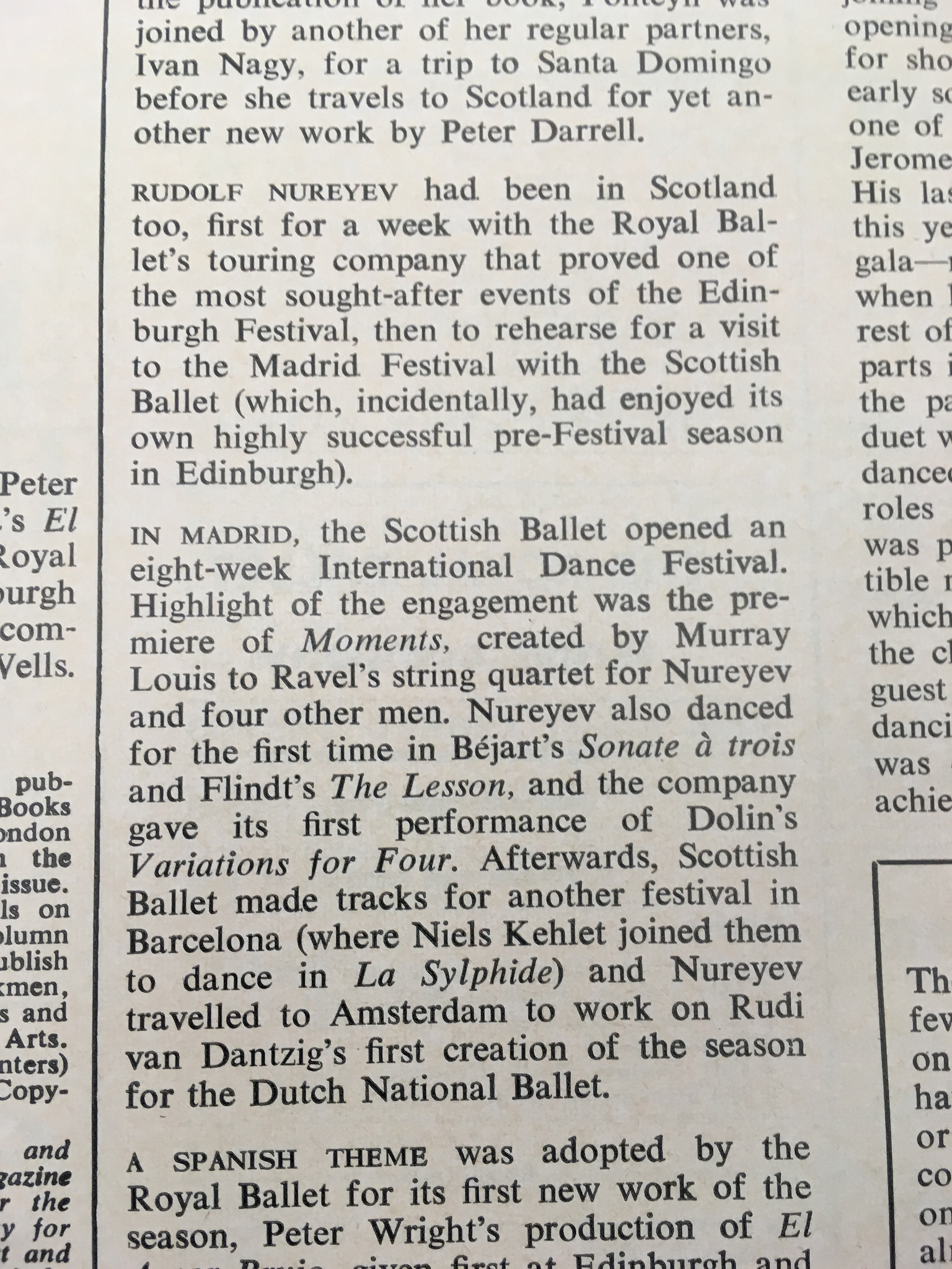 The company performed a mixture of classic and modern pieces in the Madrid festival with Nureyev appearing in many, though not quite all, of them: Moment; Apollo; Variations for Four; Paquita; Three Dances to Japanese Music; The Lesson; O Caritas; La Sylphide; and Sonate à trois.