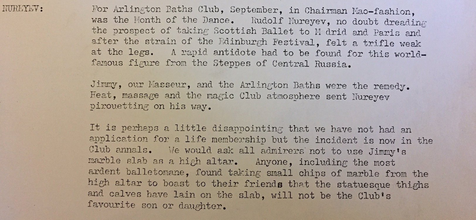 It was during this collaboration with Scottish Ballet that Nureyev came to the Baths. In the 1970s the Baths employed a masseur known as ‘Wee Jimmy’ and the dancer came to him for a massage. The visit was described in the Baths’ newsletter, recently discovered in a box file in the Club’s basement.