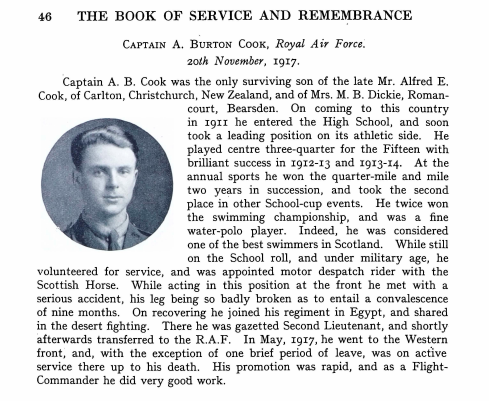 He was born in New Zealand where his father, Alfred E Cook, died when A Burton Cook was a boy. He came to Scotland in 1911, when he would have been about 15 years old and then started at the High School of Glasgow where, according to the High School Book of Service and Remembrance, he was an all-round athlete.
