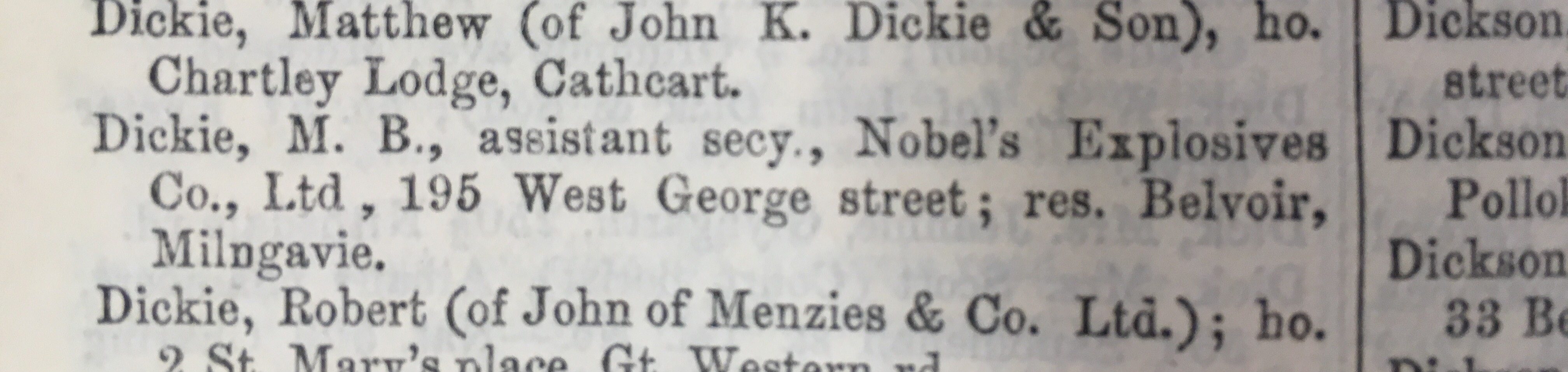 His occupation In the 1911 census is the assistant secretary of a commercial company called Nobel. He is also listed in the Post Office Directories. The first entry is 1910-11 when he is listed as Dickie, M. B; Assistant Secretary, Nobel’s Explosive Company Limited, 195 West George Street; residence, Belvoir, Milngavie. He continued to be listed throughout the war, and in the 1916-17 Directory his residential address is the one at Roman Court in Bearsden.