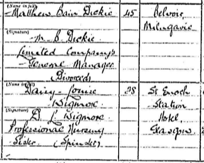 It seems that the marriage between her and Matthew had also ended. For on 26 January 1925 Matthew Bain Dickie, 45, married Daisy-Louise Wigmore, 28, in Glasgow. He was now the general manager of a limited company, and she was a professional nursing sister. It is noted in the records that Matthew is divorced. His address, again, is the family home of Belvoir and the wedding was witnessed by his sister Susan Dickie and her husband Robert Watt, who are also living at there. It’s possible that the bride is not from the Glasgow area as her address is given as the St Enoch Station Hotel.