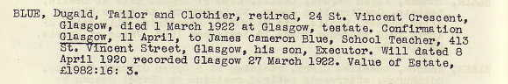Dugald’s father died on 1 March 1922. His death was confirmed by his youngest son, James Cameron Blue, 28, whose profession was the same as his dead brother’s – he was a school teacher.