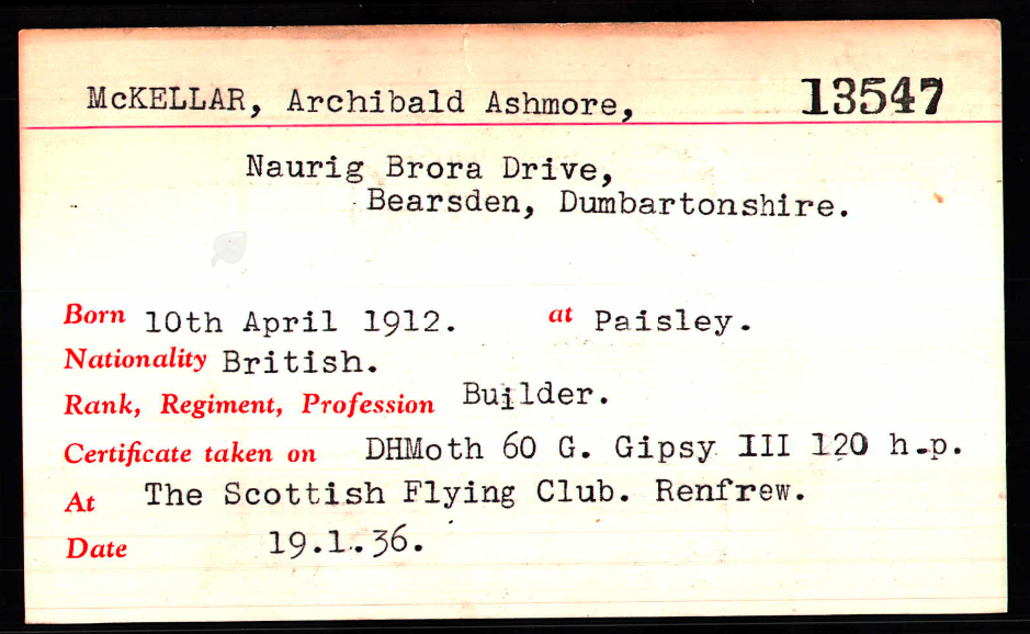 In January 1936 McKellar was awarded a Royal Aero Club Aviators’ Certificate – his flying license – at the Scottish Flying Club in Renfrew.