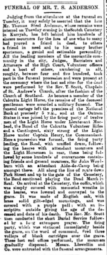 Around 4-500 people took part in the funeral procession and were present at the ceremony, including “All the leading members of the mercantile community in the city, Judges, Barristers and Attorneys of he High Court, Volunteer Officers and a host of others…”