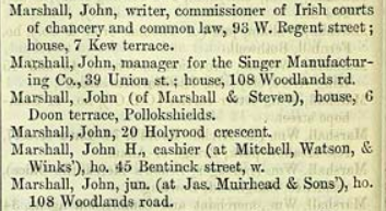 The Marshall family lived at 16 Sandyford Place between 1852-61 and are part of a family business of writers – which was a role in the legal profession – called Marshall, Hill & Hill, of 41 West George St., agents for the Family Endowment Society of London. Family endowment societies were insurance companies set up into which parents would pay an annual fee and the annuity would be paid out as the child became of age to pay for expenses such as education or ‘fitting out’.