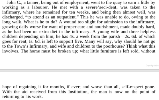 In 1877 The Englishwoman’s Review of Social and Industrial Questions published a copy of the first report from the Glasgow Sick and Poor and Private Nursing Association, explaining that the purpose was to provide provide trained and experienced nurses to attend the sick poor in their own homes. It was a charity but also funded by providing a service to other citizens who could afford to pay for private nursing.