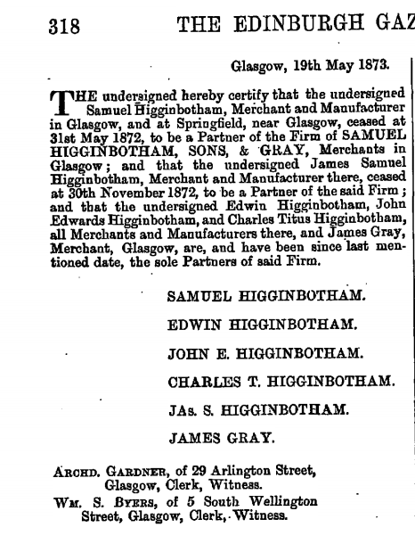 Samuel died in 1881 at The Glade, Hampstead, London, aged 83. He left £17,500 in his will. Two of his executors were his sons, Glasgow merchants Charles Titus Higginbotham of Springfield Court, Queen Street, and James Samuel Higginbotham, of 104 West George Street.