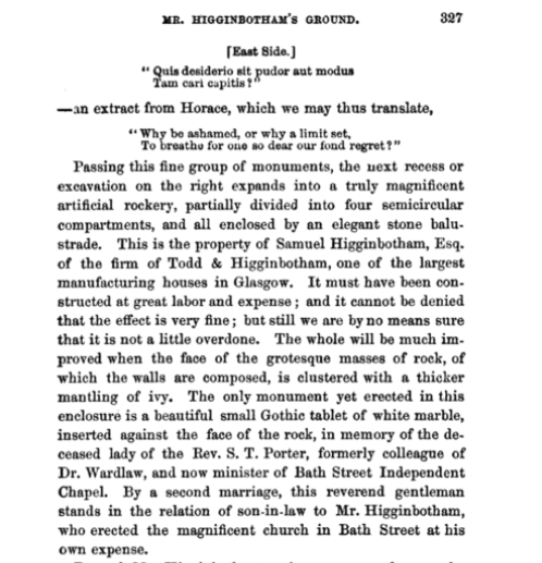 This description of the Higginbotham mausoleum in the Glasgow Necropolis was written in 1857, which indicates that the family had continued to be non-conformists, funding the construction of a chapel in Bath Street.