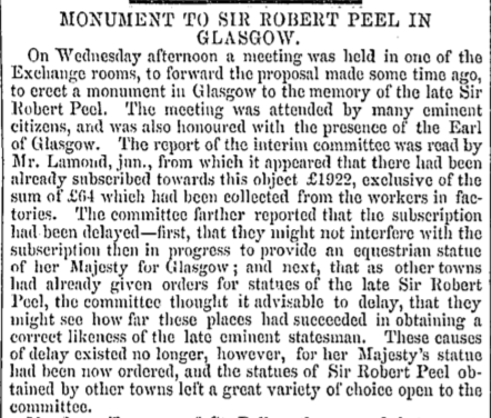 This was also the year that Robert Peel statue, sculpted by John Mossman, was eventually erected in Glasgow’s George Square.