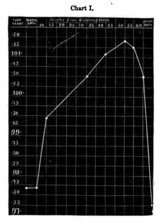 He performed them on himself at the Arlington, heated by Constantine’s stoves, emphasising the importance of a continuous flow of hot dry air to avoid the accumulation of moist air over the skin. He used an initial heat of 170°F (77°C) for a few minutes to produce diaphoresis — sweating — followed by a maintenance temperature of 130°F (54°C) for up to 60 minutes.