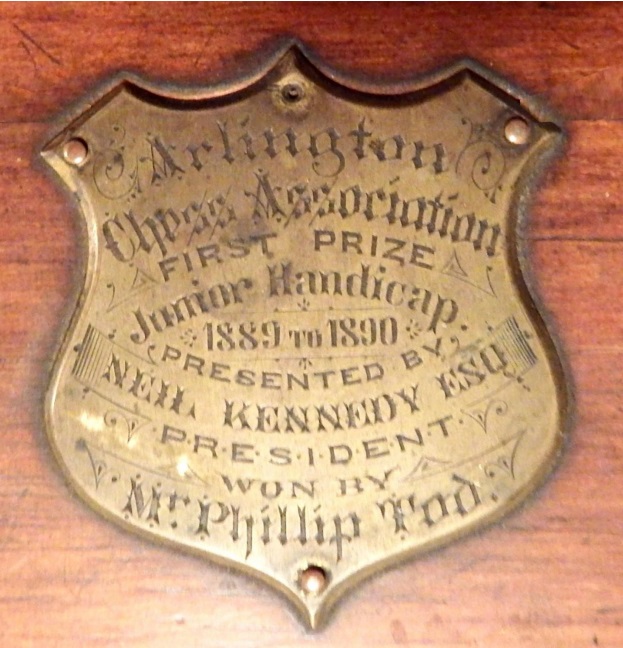 The chess set had been awarded to a young man named Phillip Tod in 1889/90 for winning the Arlington Chess Association junior division.
