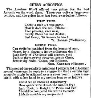 Research also revealed more about Neil Kennedy, the President of the Arlington Chess Association who presented the set to Phillip Tod. He was a “manufacturer and warehouse man” and was about 50 at the time of the 1889-1890 tournament. He had been interested in chess for more than a decade. In 1877 he won second prize in a competion in Scientific American magazine to write an chess acrostic poem.