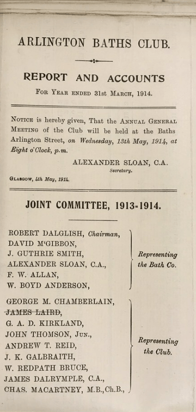 He continued to be active in the life and management of the Baths during the War. For example, swimming competitions in the Baths were suspended or scaled back during the war years but in 1916 James Dalrymple suggested a competition for the boys. He became one of the six trustees of the club on 9 May 1917, alongside William Boyd Anderson, Andrew T Reid, F W Allan, Robert Dalglish and John Thomson Jnr. The trustees were a group of members in whose name the shares bought from the Glasgow Swimming Bath Company were registered.