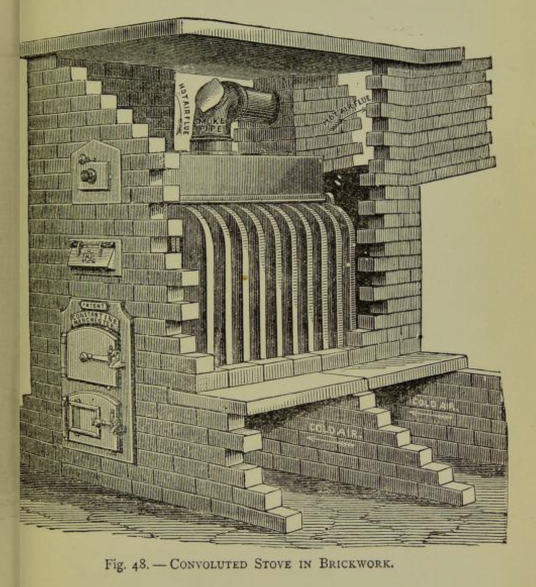 “Under the end of the hottest room furthest from the door are placed two large hot-air stoves. Fresh cool air from openings in the basement flat passes over the heating surface of these stoves, and ascends through the grating immediately over the apparatus…”