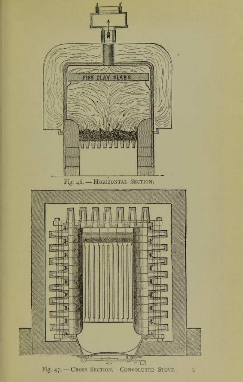 These two stoves were Constantine Convoluted or ‘gill’ stoves, invented in 1866 by the Turkish bath owners, Joseph Constantine and Thomas Whitaker. These illustrations of how they operate are from Practical ventilation and warming published by Joseph Constantine in 1881.