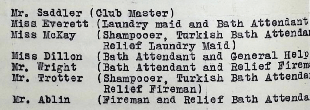Miss Annie McKay was another long-standing member of staff from these early years. She retired in 1938 having ‘been in the constant service of the Club for almost 40 years’. She worked as a Shampooer, Turkish Bath Attendant and Relief Laundry Maid. Though she had reduced her hours in 1934, she was 72 when she finally retired, receiving a pension of £1 a week from the Club.